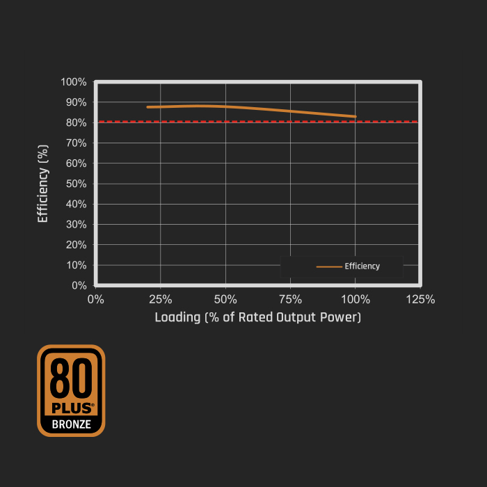La serie BZX V2 con certificado 80Plus Bronze es una fuente de alimentación full modular con cables planos extralargos y componentes de máxima calidad, preparados para suministrar energía con una eficiencia estable y superior al 85% a máximo rendimiento.